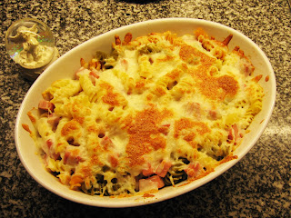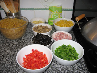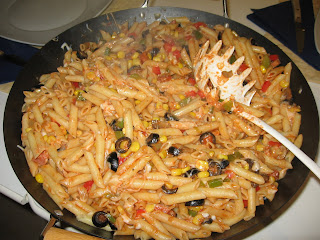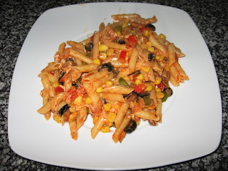 Começo por fazer um refogado. Enquanto a cebola está a alourar coloco um pouco de pimento verde (não muito). Quando a cebola alourou, coloco então o bacon, deixando-o fritar um pouco. Acrescento um pouco de cogumelos, e posteriormente mais um pouco de pimento (tanto verde, como vermelho). Vou colocando vinho verde de modo a não deixar queimar e para deixar um certo gosto. De frisar que isto é efectuado tudo com o lume no máximo, de modo a que o vinho também vá evaporando depressa. Coloco mais um pouco de cogumelos. Vou temperando também a meu gosto, com pimenta branca, sal noz-moscada e orégãos (Isto vai sendo colocado também durante o cozinhado, mais que 1 vez mas sem ser em excesso, mas obviamente parte do gosto de cada pessoa, podendo ser utilizadas outras especiarias). Coloco mais um pouco de cogumelos e pimento, e acrescento já talvez 2/3 do milho (um pouco menos talvez). Vou tendo sempre atenção para que não queime, virando constantemente a comida e acrescentando um pouco de vinho branco. Coloco ½ da quantidade de azeitonas, e mais um pouco de milho (assim como o resto de cogumelos e pimento). Pouco depois, deito a polpa de tomate, juntamente com o resto das azeitonas e milho. Vou virando de modo a misturar bem, e acrescentando a polpa de tomate até achar suficiente (não tenho uma quantidade exacta, apenas a suficiente para quando misturar com a massa, esta ganhe um tom mais alaranjado). Após a polpa de tomate, o vinho já não será necessário, deixa-se um pouco ainda com o lume no máximo misturando-se bem a comida, e para o excesso de “água” vá evaporando. Depois, coloca-se em lume brando enquanto a massa acaba de cozer. O tempo de confecção acabará por ser o mesmo do tempo de cozedura de massa, começando-se o refogado no mesmo momento em que se começa a ferver a água para a massa. Vai-se tendo sempre atenção para a comida não queimar nem ficar agarrada ao wok (ou tacho). Quando a massa está pronta, desliga-se tudo, escorre-se a massa e vai-se despejando para o wok enquanto se vai misturando. Durante a mistura, vai-se deitando cubos pequenos de queijo flamengo, assim como queijo ralado de modo a ficar-se com fios de queijo derretido. Assim que estiver tudo convenientemente misturado pode-se levar à mesa.