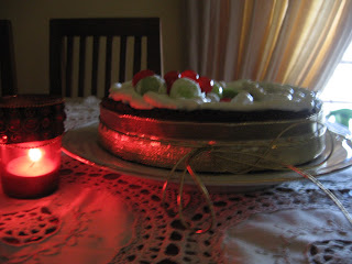 chantilly ou glacê (usei glacê), frutas frescas, uvas sem sementes, figos, cerejas, kiwi, pêssego, etc (na decoração usei uvas, kiwi, e cerejas cristalizadas, para o próximo vou usar outras).....para dar o efeito de neve passe as frutas lavadas no açúcar e deixe na geladeira por meia hora.......