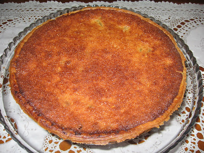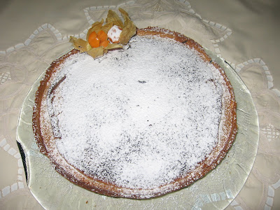 Além disso:1 forma com fundo móvel com 36 cm de diâmetro, manteiga para untar a forma,120 gr de doce de laranja (usei doce de abóbora) 80 gr de lascas de amêndoas torradas, açúcar em pó para polvilhar.