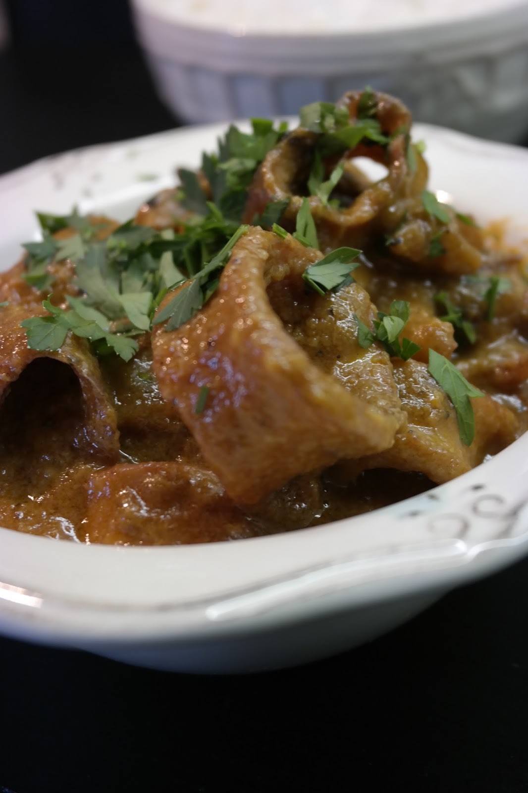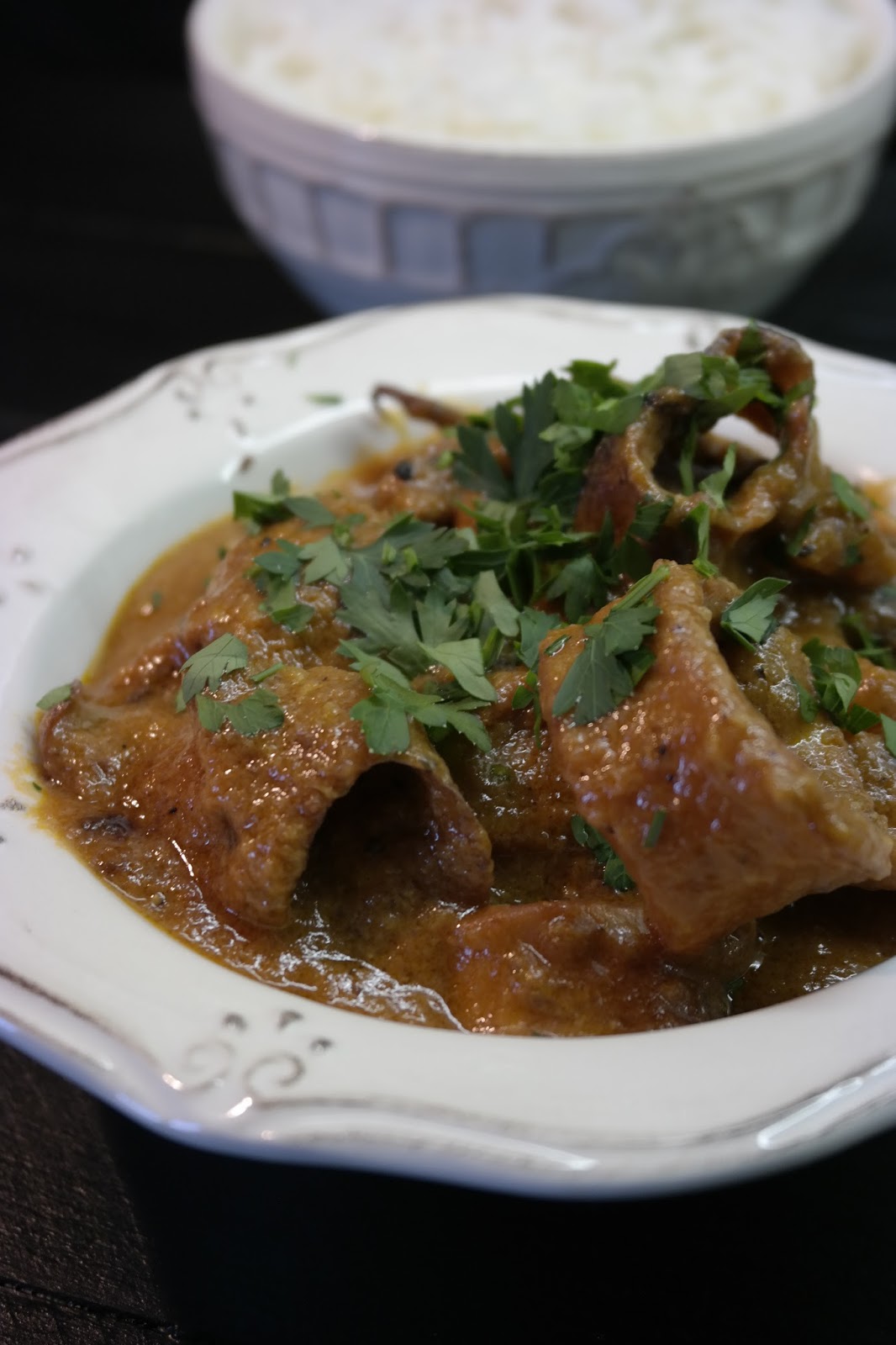 Montagem: Num tabuleiro de barro cobri o fundo com puré, depois foi cobrir com a mistura da carne (mas não escorro totalmente o molho (grosso) gosto do empadão húmido) e voltei a cobrir com o resto do puré de batata. Bati uma gema e pincelei a superfície, com um garfo fiz uns enfeites. Levei ao forno até alourar o ovo. Servi com uma salada verde.