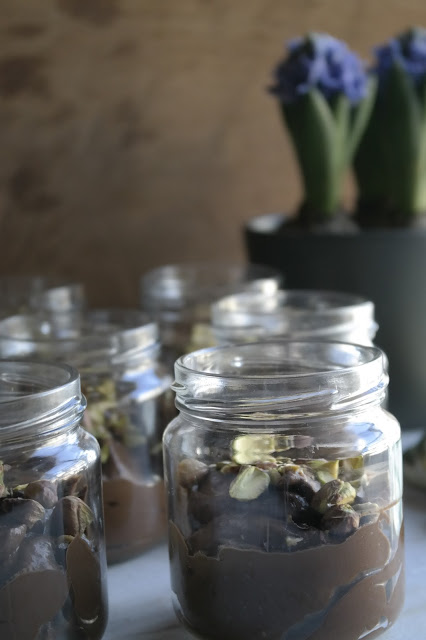Notas: A mousse do R. estava polvilhada com nozes, eu preferi com os pistácios,e também disse que se pode colocar chocolate negro/preto. Eu juntei 100 g de chocolate negro/preto 74% de cacau Lindt derretido em banho-maria e adicionei junto dos restantes ingredientes no processador.