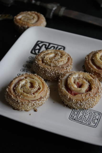 cobrir com fatias de queijo, enrolar estilo uma torta. Com a ajuda de uma faca de serrilha cortar fatias e passar por sementes de sésamo. Colocar as fatias num tabuleiro forrado com papel vegetal e levar ao forno pré-aquecido a 180ºC, o tempo de cozinhar a massa o que é rápido.