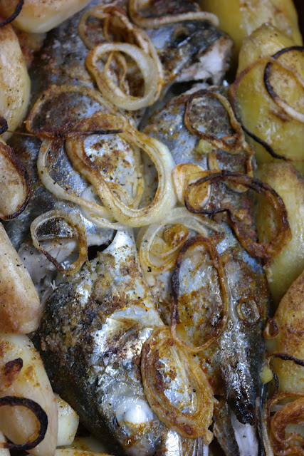 Num tabuleiro coloquei uma camada de cebola cortada às rodelas, por cima coloquei os chicharros, as batatas brancas previamente cozidas (mas firmes), a batata doce cozida (mas firme), cebola cortada em rodelas, polvilhei com colorau, temperei com sal marinho, reguei com azeite e borrifei com um pouco de vinho branco. Levei o tabuleiro a forno pré-aquecido a 200ºC, o tempo de alourar e cozinhar o peixe. Servi com uma salada verde. A simplicidade no seu melhor!