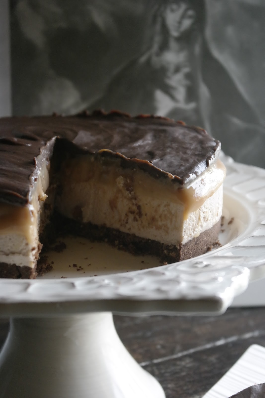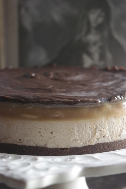 No processador triturei as bolachas até obter uma areia grossa. Numa tigela coloquei as bolachas, cacau e manteiga derretida em banho-maria e envolvi bem. Forrei o fundo de uma forma amovível com a mistura. Reservei no frigorífico. Bati as natas em chantilly reservei. Bati o queijo creme com o açúcar em pó e adicionei as folhas de gelatina, previamente demolhadas em água fria e derretidas, e 2 colheres de sopa de creme de caramelo, envolvi muito bem. Adicionei o chantilly e envolvi bem com uma espátula. Deitei a mistura na forma com o fundo forrada com a mistura da bolacha. Levei ao frigorífico durante 4 horas antes de continuar com o processo. Ao fim desse tempo (firmar o creme) deitei por cima o creme de *caramelo com o amendoim (frio) e alisei com a ajuda de uma espátula, levei de novo ao frigorífico (de um dia para o outro), ao fim desse tempo coloquei a *ganache e levei de novo a forma ao frigorífico até firmar a ganache. Servi ao fim de 4 horas.