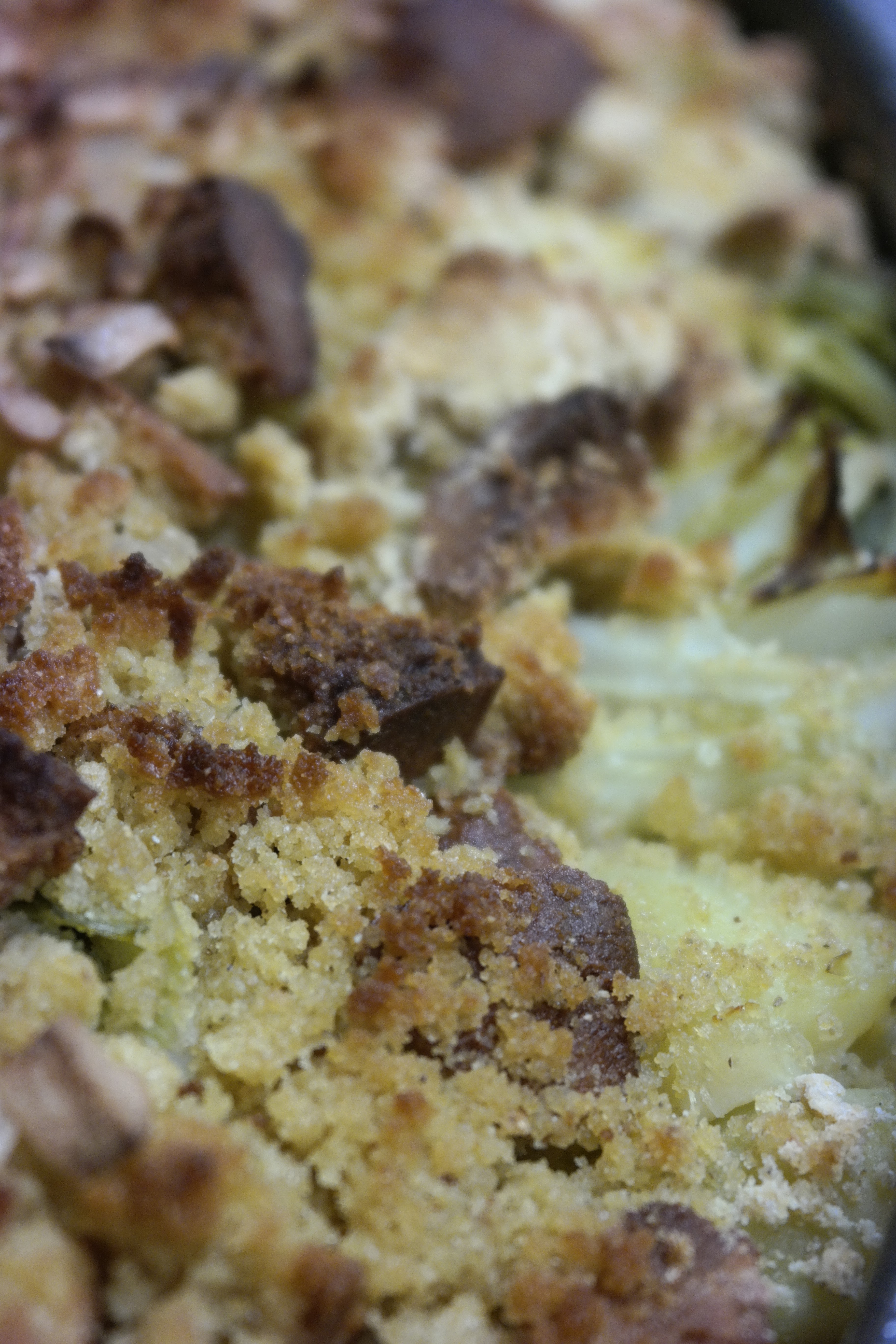 Numa tigela coloquei as couves, batatas, bacalhau e os ovos, e adicionei azeite aquecido com uns dentes de alho picados, e envolvi muito bem. Deitei o preparado num tabuleiro de barro, polvilhei a superficie com a broa picada, adicionei dentes de alho picados e reguei abundantemente com azeite. Levei o tabuleiro ao forno pré-aquecido a 180ºC até aquecer o preparado e alourar a broa. Servir de seguida.