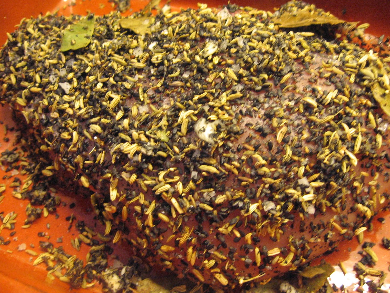 Limpei uma perna de peru, cortei aos bocados e reservei. No meu adorado Almofariz deitei uma colher de (sopa) de cominhos, 3 dentes de alho descascados, sal marinho, pimenta-preta em grão, um molho de folhas de salsa (só as folhas) 6 ameixas pretas sem caroço cortadas aos bocadinhos, Juntei 2 colheres de (sopa) de azeite e moí a mistura até fazer uma pasta. Num tabuleiro cobri o fundo com cebola cortada às rodelas. Reguei a mesma com um fio de azeite. Com a pasta que fiz anteriormente no almofariz besuntei os bocados da carne e coloquei no tabuleiro por cima da cebola. Borrifei com um cálice de vinho do Porto. Levei o tabuleiro ao forno pré-aquecido a 200ºC, fui virando durante a sua cozedura.